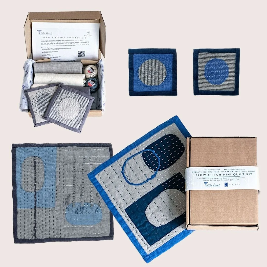 Our Slow Stitched Mini Quilt Kits and Slow stitched Coasters Kits are suitable for adults with no previous sewing experience. This is part of a collaboration between textile artists Rebekah Johnston and Helen Round. Helen creates beautiful and functional linen products inspired by the flora and fauna of the Cornish countryside and coastline. Rebekah creates quilted textiles that explore themes of emotional wellbeing. Together they share a passion for sustainably sourced linen making this a dream collaboration!