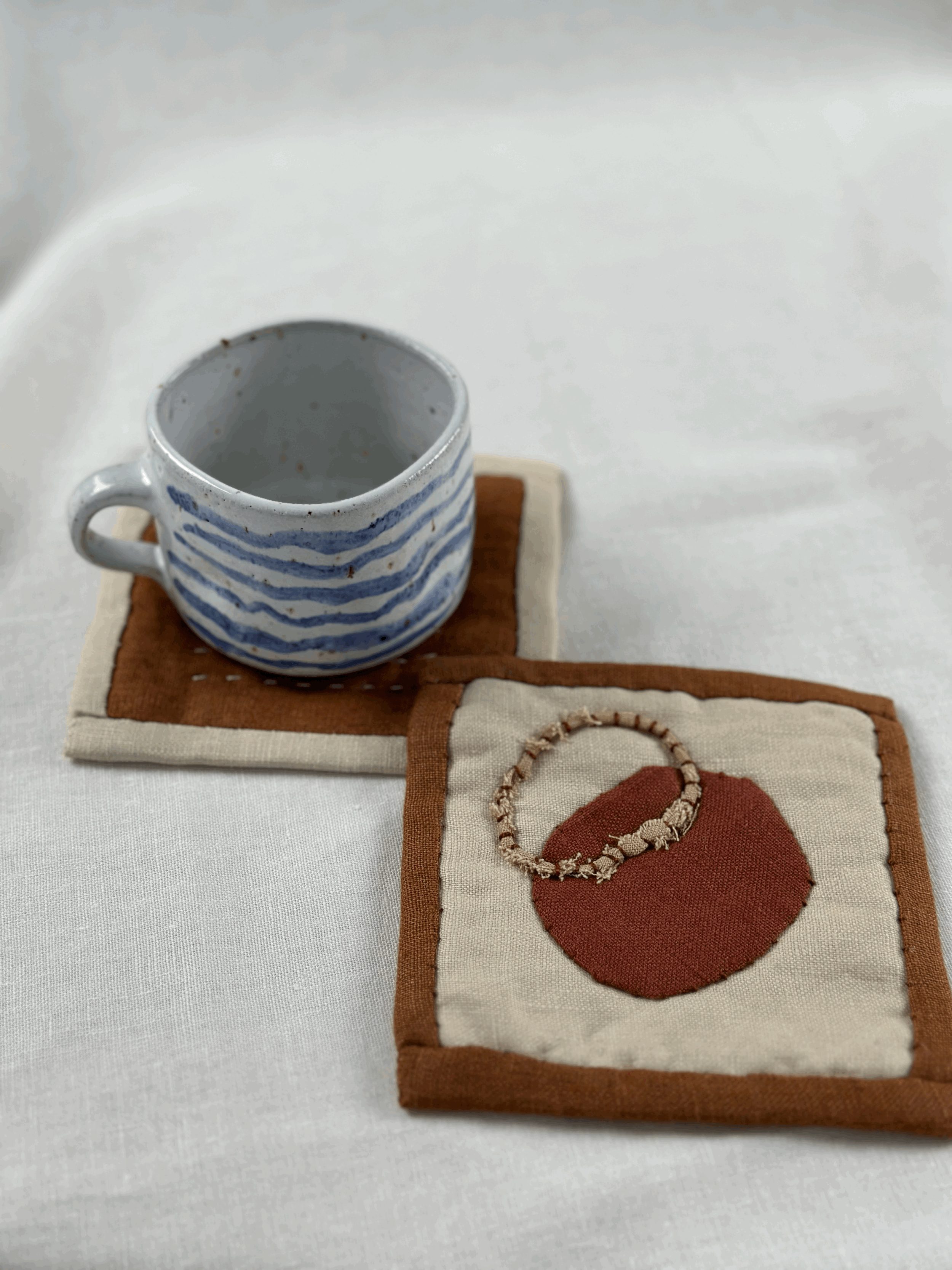 Of course mini quilts have the added bonus of also being functional textiles. The cotton wadding inside the quilt can be used as a heat proof mat for your cup of tea. Although you may have mixed feelings about using something that has many hours of hand stitching getting stained, it is a lovely way of making these objects part of your everyday routine. Remember to handle handmade items with care and be prepared for potential shrinkage when washing.
