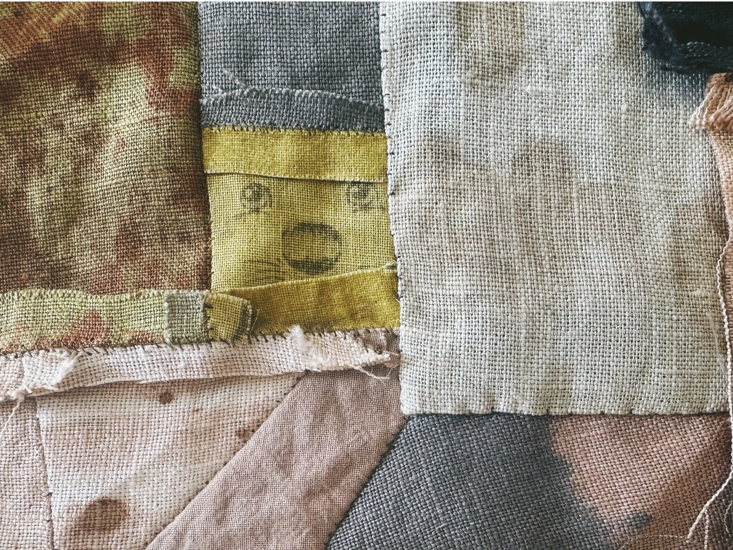 Plant dyed repurposed linen and cotton domestic fabrics.
