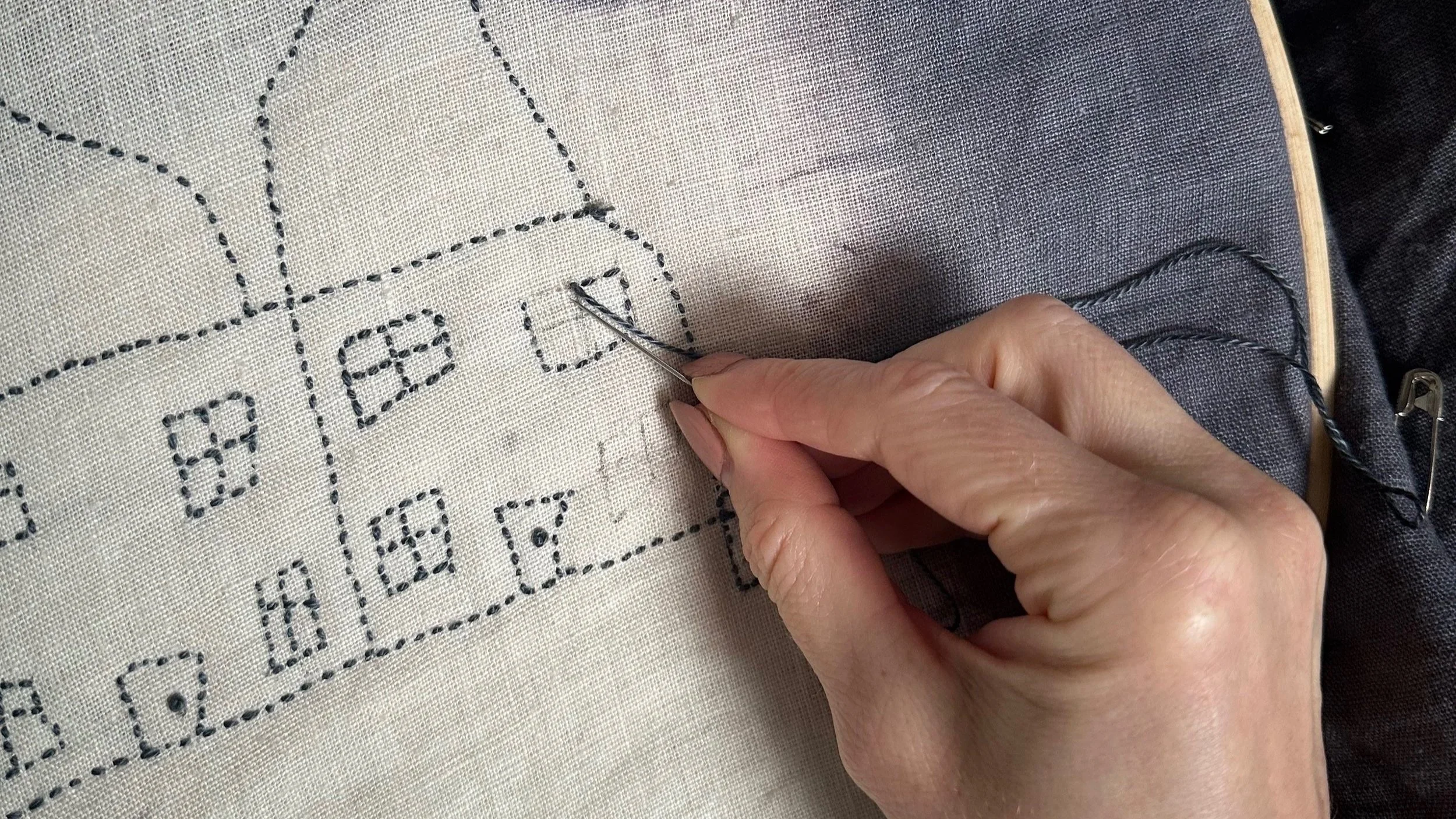 My first thoughts stemmed from the parallels between fabric mending as an act of care and the restoration of a family’s sense of home. As I read through the interview transcripts, I noted words and phrases that resonated with me—many carrying a strong tactile quality, like “torn from the family home” and “fabric of society.” These expressions felt perfectly suited to textile techniques such as patching and mending, echoing the themes of repair and resilience. Among the materials, I was especially moved by children’s drawings included in the interviews, and I knew early on that I wanted to incorporate these in the work. From these starting points, I mind-mapped ideas, imagining how textile processes could capture these experiences.