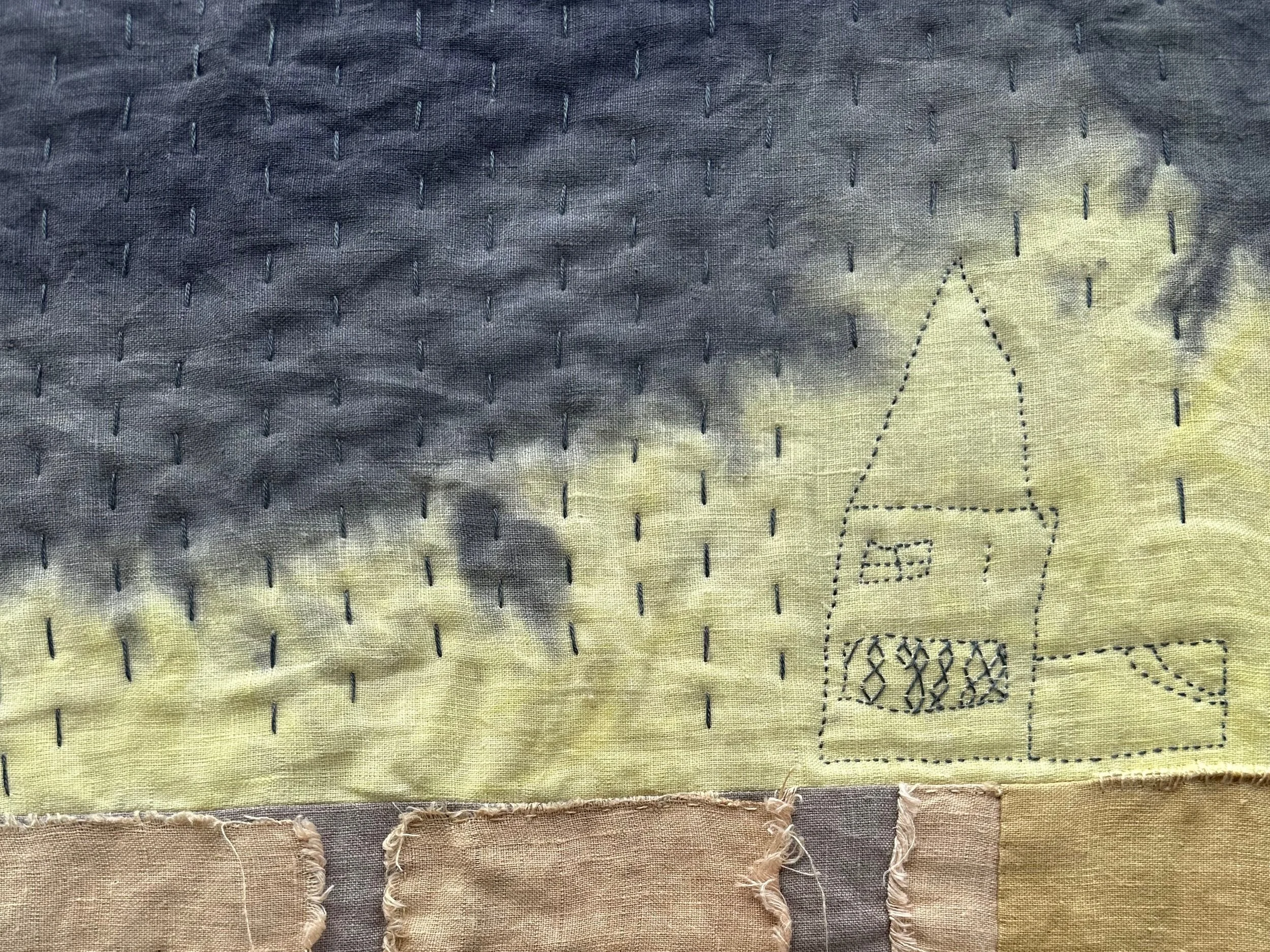 The quilt’s patchwork of shapes, textures, and tones symbolises the fragmented nature of displacement. Darker, fading sections evoke uncertainty, while warmer, hand-dyed fabrics represent the lingering memories and emotional ties that persist even in the face of loss. There are nods to physical structures—houses and walls—that should protect, yet can so easily become fragile and unsafe.The interviews profoundly affected me, particularly the experiences of children who have had to adapt to frequent relocations and the immense mental load carried by parents. Hearing their stories made the reality of instability deeply personal. It became clear that the strain of such uncertainty reaches beyond the physical—into the very core of familial relationships and emotional well-being.